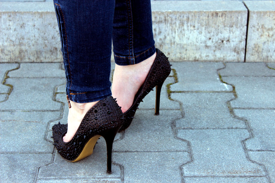 Mimo, że ostatnio dobry humor mi nie dopisuje, a na domiar złego od rana kicham i smarkam, postanowiłam oderwać się chwilę od zmartwień i dodać nową stylizację. Nie jest to jakieś wyszukane połączenie, ale nie nazwałabym go również nudnym. Proste połączenie jeansy, biały t-shirt i ramoneska zawsze się sprawdza. Pazura dodają całości szpilki z ćwiekami. Uważajcie, są naprawdę ostre ;)